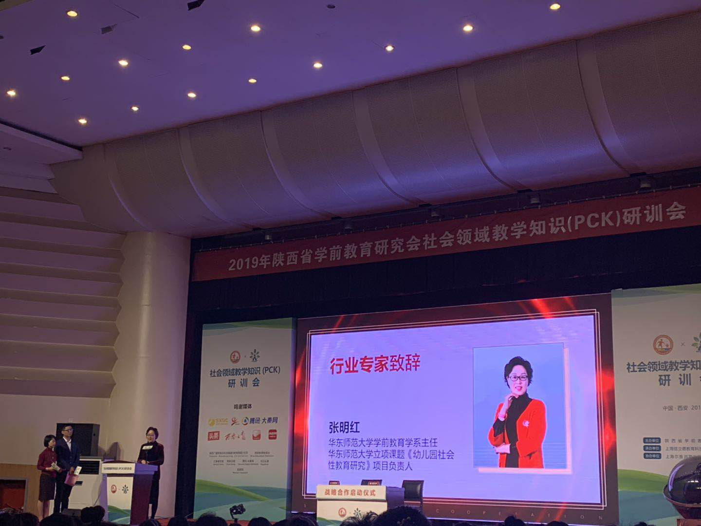 2019年4月14日9:00,研训会在碑林区边家村工人文化宫影剧院正式开幕。陕西省学前教育研究会会长吕明凯与研究会领导成员、华东师范大学教育学部黄瑾、张明红教授携数学PCK专家团队出席。参加会议的有700名幼儿园园长和骨干教师,还有我院6名学前教育专业的教师。