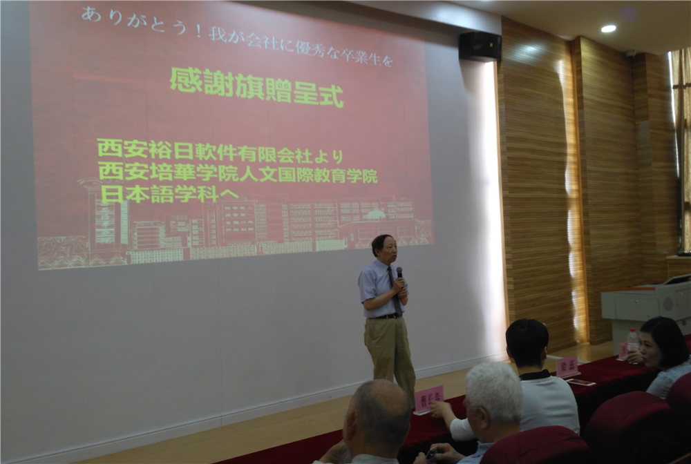 6月7日上午,西安裕日软件有限公司对日直送事业部部长张辉先生专程前来我校,向我院日语系赠送了一面题为“培育英才 蜚声内外”的锦旗。