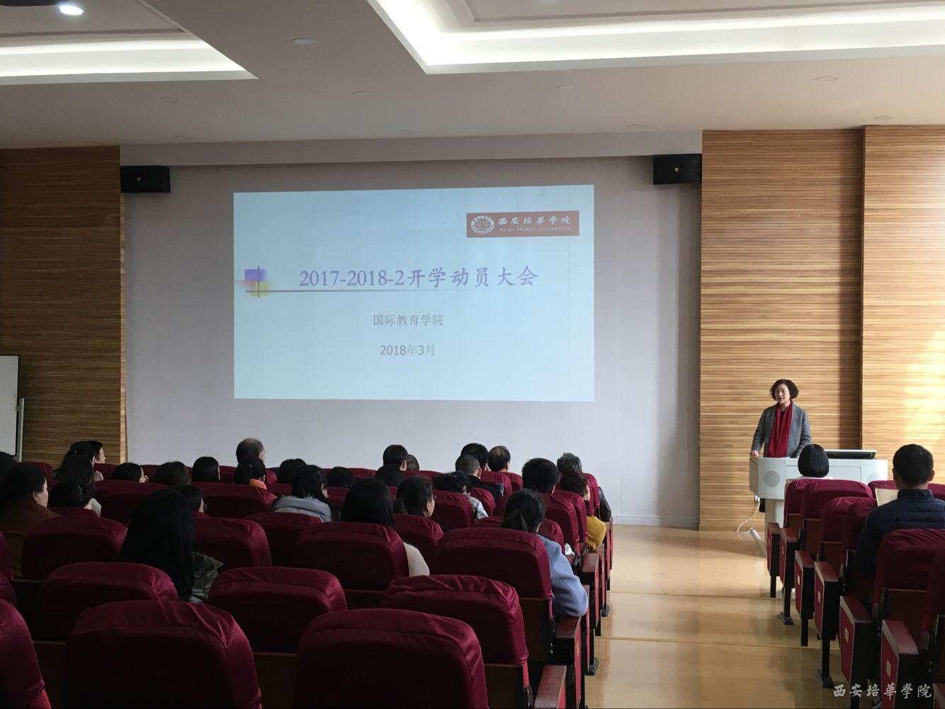 新风貌迎接新学期,新思路指引新发展。3月1日,农历正月十四,迎着新年的晨曦,国际教育学院于J101教室召开了新学期开学动员大会。出席此次会议的人员有:西安培华学院副校长、国际教育学院院长刘越莲教授;国际教育学院党总支书记兼行政副院长梁蕊教授以及我院全体教职工,会议由梁蕊副院长主持。