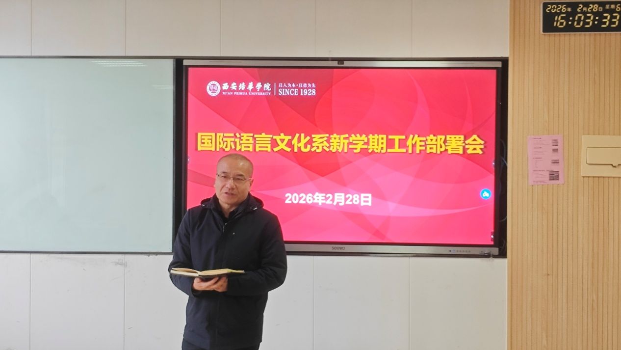 2026年2月28日,国际语言文化系新学期工作部署会议在格物楼1301教室顺利召开。国际语言文化系全体教师参加会议,就学院和系里2026年重点工作,统一认识,统筹安排。
