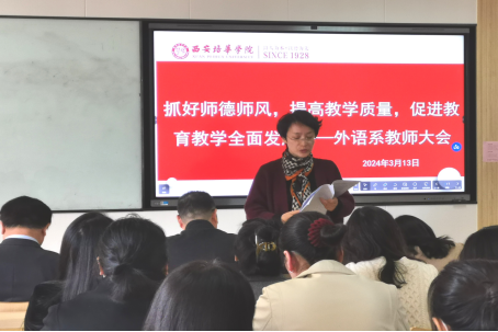 3月13日下午,人文与国际教育学院外语系在1401教室召开全系教师大会,学习学校有关师德师风方面的文件精神,安排部署本学期的重点工作。