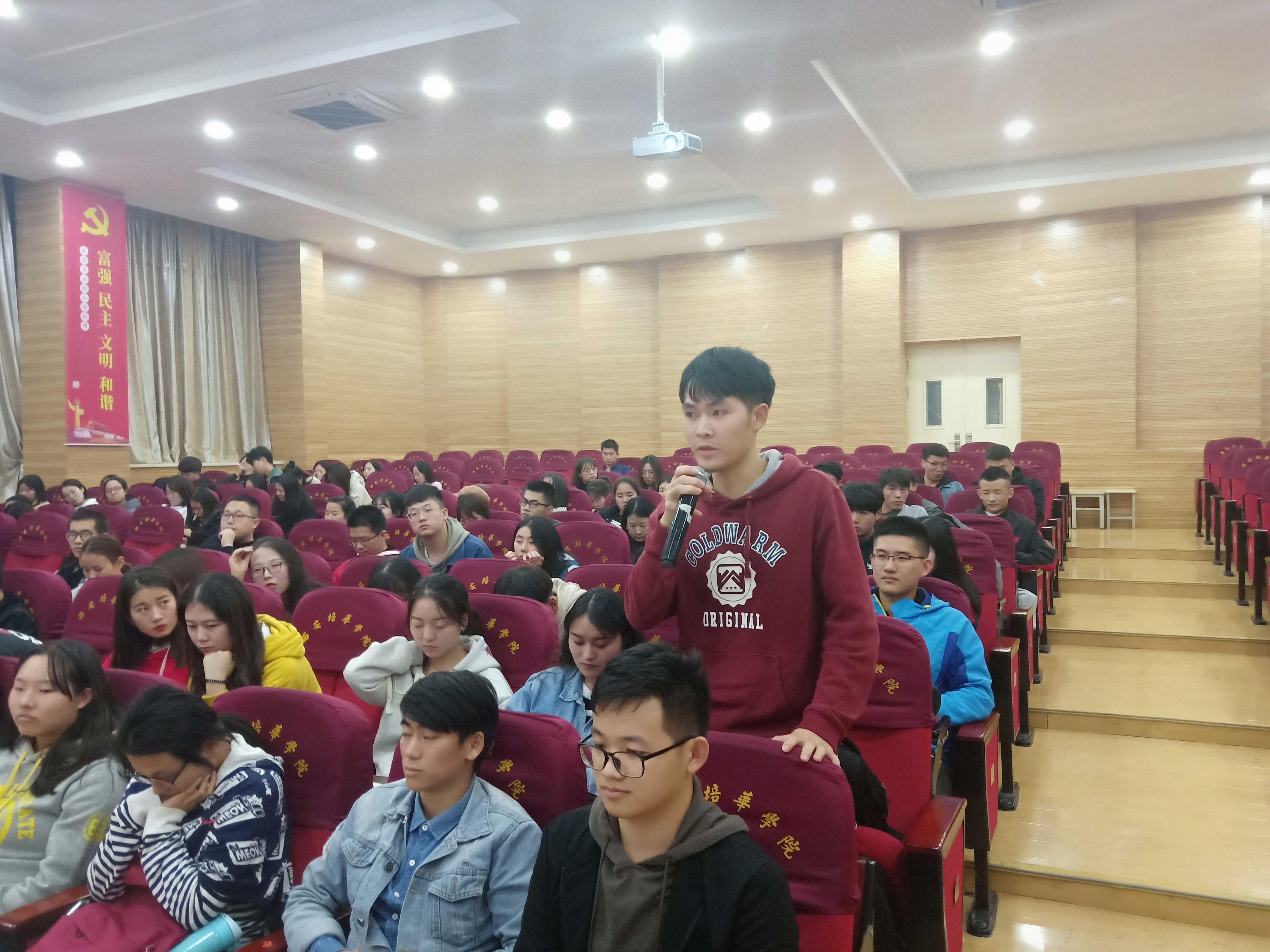 观影结束后,由主持人向现场同学提问观影后的心得感想。学生第三党支部邱太宽同志说:“这是我第二次看《建党伟业》这部电影,第二次依然让我热血沸腾,特别是五四运动中,爱国学生因不满参加巴黎和会的中国代表在凡尔赛和约上签字,上街游行、火烧曹汝霖个人官邸赵家楼的事件。通过观看《建党伟业》,我感受到,人民才是国家的主人,党的领导,是历史的选择,是人民的选择。只有中国共产党才能带领人民革命成功,只有中国共产党才能带领全体人民完成伟大的复兴。”