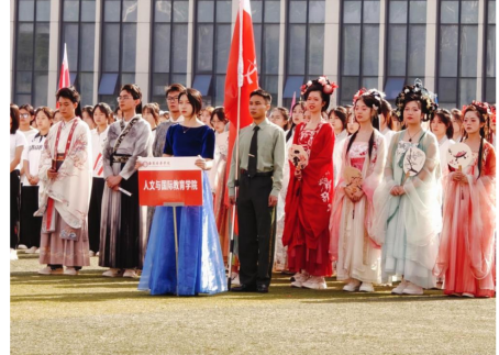 风传花信,雨濯春尘。这是一支特别的队伍,是由88位国家奖学金与国家励志奖学金获得者组成的方阵。火红的校旗随风扬起,迈着矫健的步伐走向主席台。他们身着马面裙,踌躇满志、意气风发,他们遨游学海、能文能武,尽显“书生意气,挥斥方遒”的青年风采,着一袭古衣,承千载风华,观乎于人文,以化成天下。