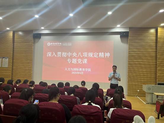 学院党委书记南兵以“深入学习贯彻中央八项规定精神”为主题,为学院师生党员代表进行了深入讲解。他强调,中央八项规定是新时代党员必须严格遵守的行为准则,是党保持先进性和纯洁性的重要保障。