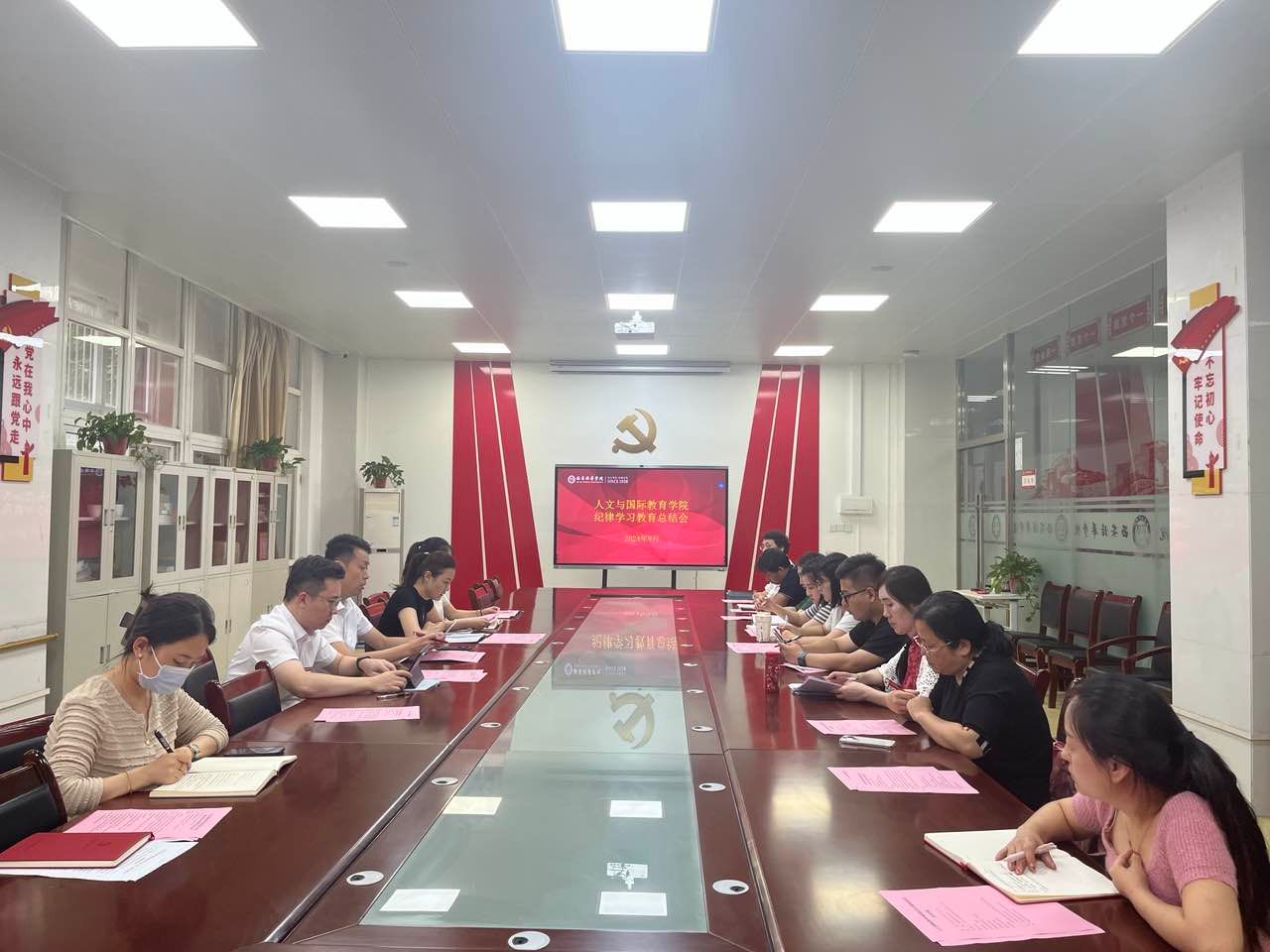 9月26日下午,人文与国际教育学院党委在格物楼第四会议室召开党纪学习教育总结会,学院全体党委委员、支部书记参会,民主党派代表曹长春列席。学院党委书记南兵主持总结会。