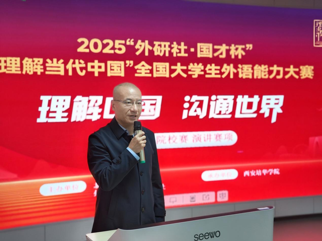 2025年10月10日,2025“外研社·国才杯”“理解当代中国”全国大学生外语能力大赛英语演讲比赛决赛在西安培华学院格物楼一楼VR教室成功举行。历经初赛选拔,共有19位优秀选手会师决赛现场,展开巅峰对决。赛事在国际教育学院国际语言文化系主任李建勇的精彩致辞中拉开帷幕。他强调了新时代外语人肩负着沟通中外、讲述中国故事的重要使命,并预祝选手们赛出水平、赛出风采。