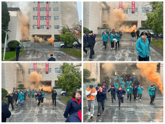 随着模拟火灾警报的响起,格物楼东广场浓烟滚滚,受训人员迅速进入应急状态,捂住口鼻,在工作人员的指引下,迅速有序撤离至楼下安全地带。