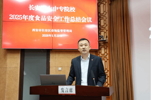 随后,西安市长安区市场监督管理局副局长马涛通报了2025年驻区大中专院校食品安全管理情况,分析当前存在的问题与不足,并对2026年校园食品安全重点工作进行全面部署,明确工作目标与具体要求。
