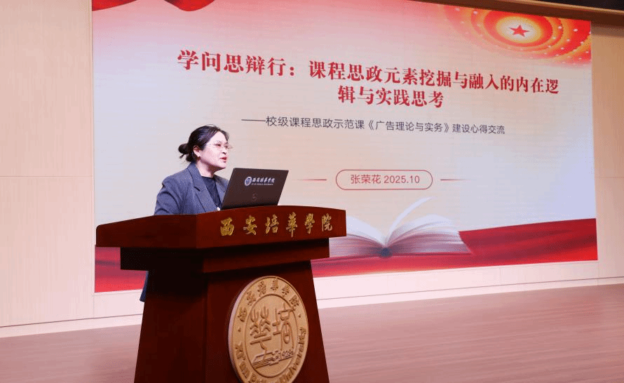 张荣花副教授以《“学问思辨行”:课程思政元素挖掘与融入的内在逻辑与实践思考》为题,分享了校级课程思政示范课《广告理论与实务》的建设心得。她提出“一五五”模式:以“立足时代、扎根大地、坚持文化自觉的广告传播”为主线,锚定“价值观引领、家国情怀、文化自信、社会责任、伦理担当”五大育人目标,通过“博学—审问—慎思—明辨—笃行”五环节,把“润物无声”做成“精准滴灌”。