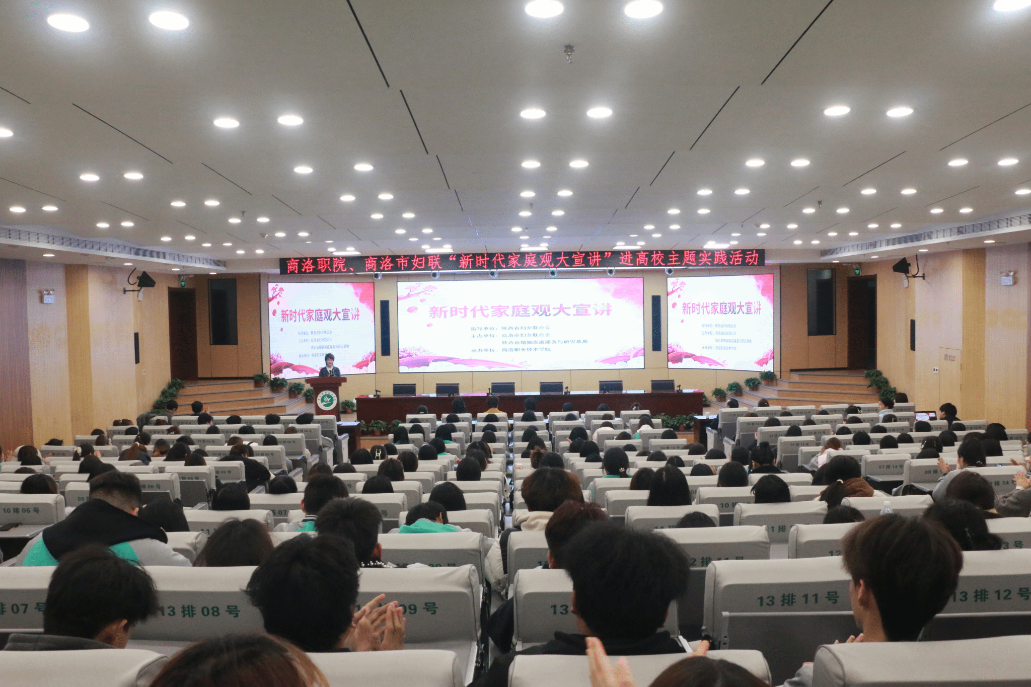 为深入贯彻落实习近平总书记关于家庭家教家风建设及培育新型婚育文化的重要指示精神,引导广大青年学生形成积极健康的婚恋观与家庭观,12月4日下午,由陕西省妇女联合会指导,陕西省婚姻家庭服务与研究基地、商洛市妇女联合会联合主办,商洛职业技术学院承办的“新时代家庭观大宣讲”进高校主题实践活动在商洛职业技术学院图书馆报告厅举行。活动以“树立正确婚恋观,走好幸福人生路”为主题。商洛市妇联主席胡燕梅,商洛职业技术学院党委副书记、工会主席吴雪,副院长李承涛,陕西省婚姻家庭服务与研究基地负责人,西安培华学院女子学院副院长李蒙,骨干教师秦园,基地专家团成员及师生代表共200余人参加了活动。