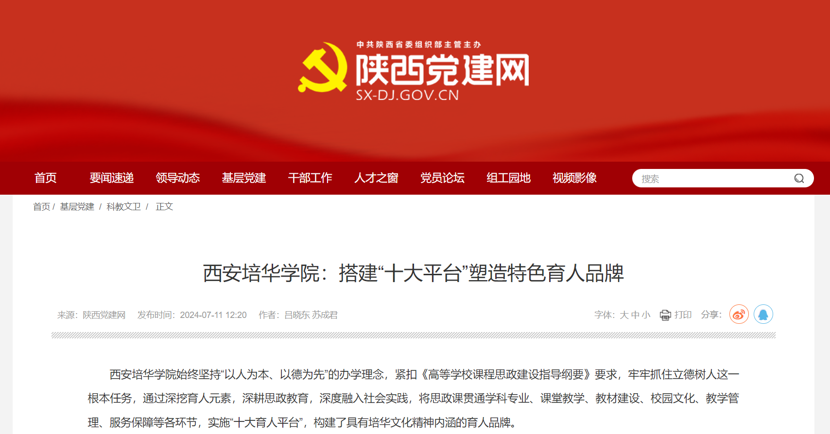 西安培华学院始终坚持“以人为本、以德为先”的办学理念,紧扣《高等学校课程思政建设指导纲要》要求,牢牢抓住立德树人这一根本任务,通过深挖育人元素,深耕思政教育,深度融入社会实践,将思政课贯通学科专业、课堂教学、教材建设、校园文化、教学管理、服务保障等各环节,实施“十大育人平台”,构建了具有培华文化精神内涵的育人品牌。
