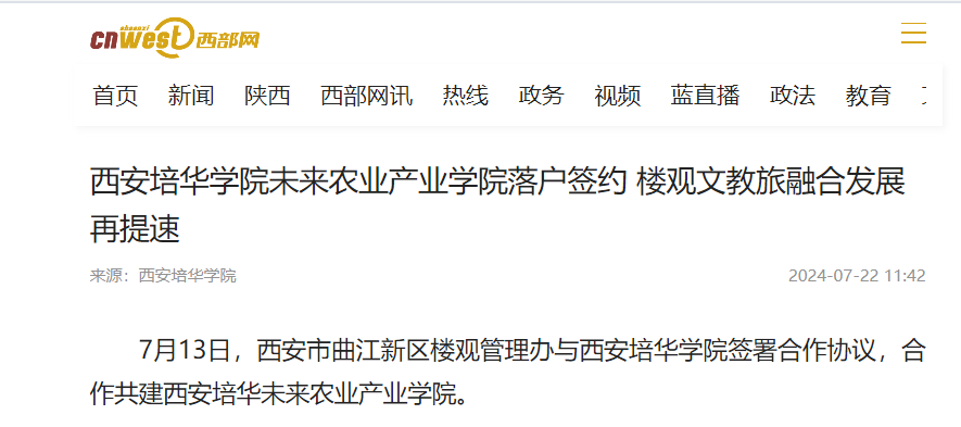 7月13日,曲江新区楼观管理办与西安培华学院签署合作协议,合作共建西安培华未来农业产业学院。