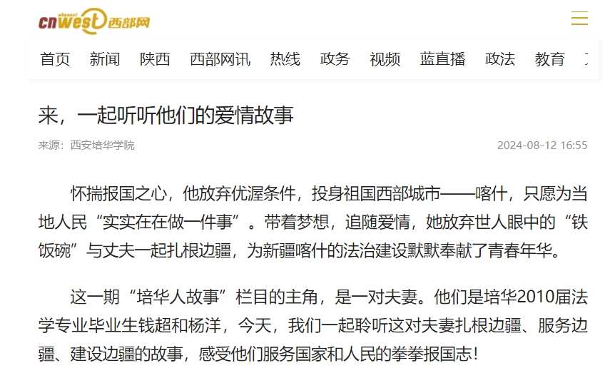 这一期“培华人故事”栏目的主角,是一对夫妻。他们是西安培华学院2010届法学专业毕业生钱超和杨洋,今天,我们一起聆听这对夫妻扎根边疆、服务边疆、建设边疆的故事,感受他们服务国家和人民的拳拳报国志!