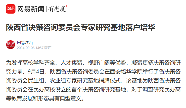 为发挥高校学科齐全、人才集聚、视野广阔等优势,凝聚更多决策咨询研究力量,9月4日,陕西省决策咨询委员会在西安培华学院举行了省决策咨询委员会民生组、农业组专家研究基地揭牌仪式。该基地为陕西省决策咨询委员会在民办高校设立的首个决策咨询研究基地,对于调查研究民办高等教育发展和形态具有典型意义。
