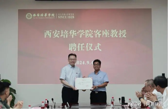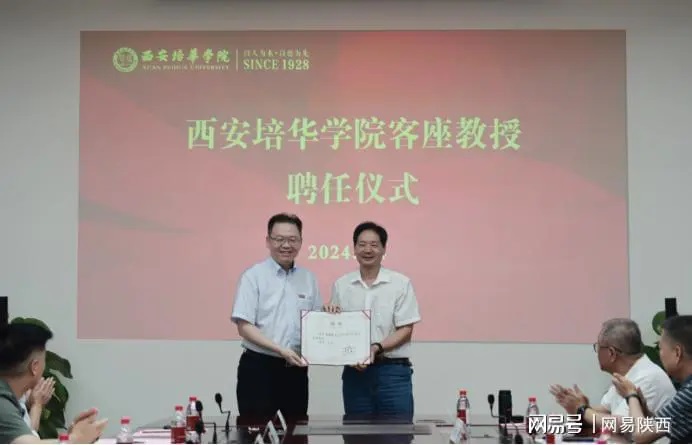 在客座教授聘任仪式环节,省决咨委民生组副组长、西安理工大学原党委书记刘德安教授,省决咨委委员、陕西省发改委原副主任王振海受聘为西安培华学院客座教授,姜波理事长向其颁发了客座教授聘书,并亲自佩戴校徽。