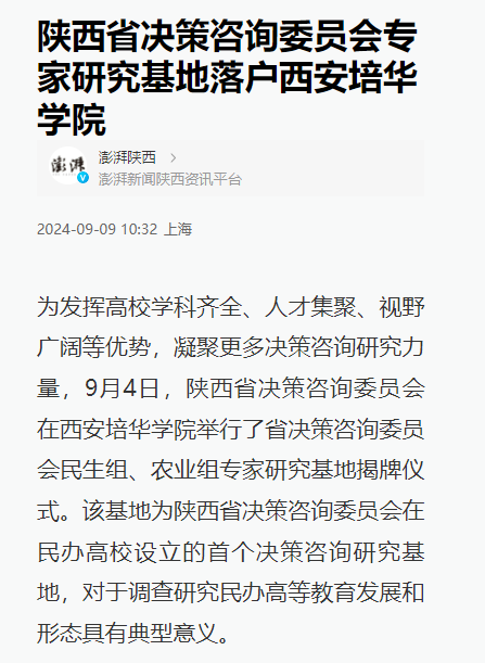 为发挥高校学科齐全、人才集聚、视野广阔等优势,凝聚更多决策咨询研究力量,9月4日,陕西省决策咨询委员会在西安培华学院举行了省决策咨询委员会民生组、农业组专家研究基地揭牌仪式。该基地为陕西省决策咨询委员会在民办高校设立的首个决策咨询研究基地,对于调查研究民办高等教育发展和形态具有典型意义。