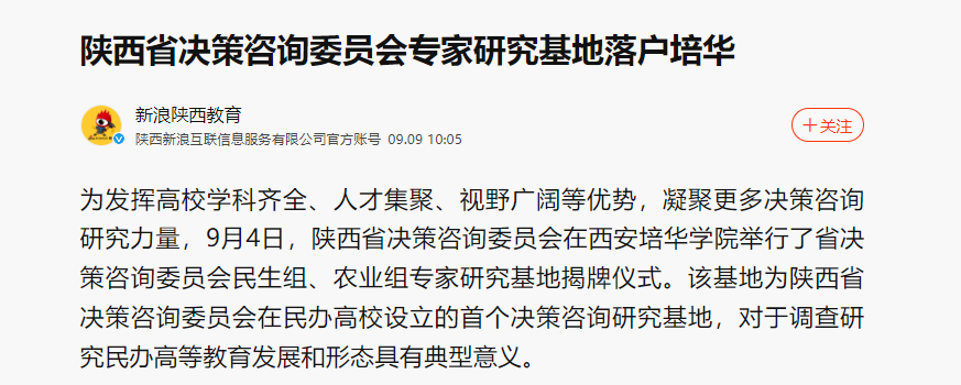 为发挥高校学科齐全、人才集聚、视野广阔等优势,凝聚更多决策咨询研究力量,9月4日,陕西省决策咨询委员会在西安培华学院举行了省决策咨询委员会民生组、农业组专家研究基地揭牌仪式。该基地为陕西省决策咨询委员会在民办高校设立的首个决策咨询研究基地,对于调查研究民办高等教育发展和形态具有典型意义。