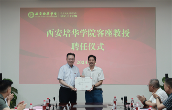 在客座教授聘任仪式环节,省决咨委民生组副组长、西安理工大学原党委书记刘德安,省决咨委委员、陕西省发改委原副主任王振海受聘为西安培华学院客座教授,姜波向其颁发了客座教授聘书,并亲自佩戴校徽。