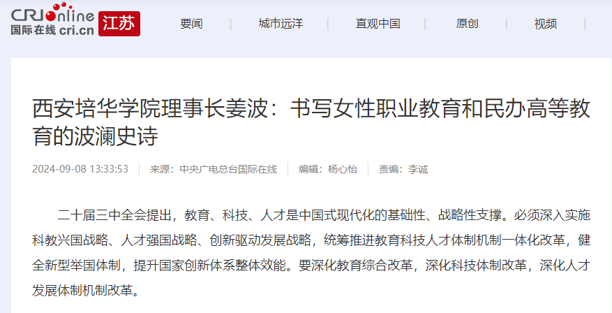 已有96年历史的西安培华学院,作为中国西部首家获得学士学位授予权的民办普通本科高校,正加快推进应用型高水平民办大学建设,奋力开启建成特色鲜明的高水平应用型大学新征程。近日,西安培华学院理事长姜波做客《总编访谈室》栏目,与陕西省政协委员、国际在线陕西频道总编辑史佳畅谈,分享“中国首家走向百年的民办大学”背后的故事。