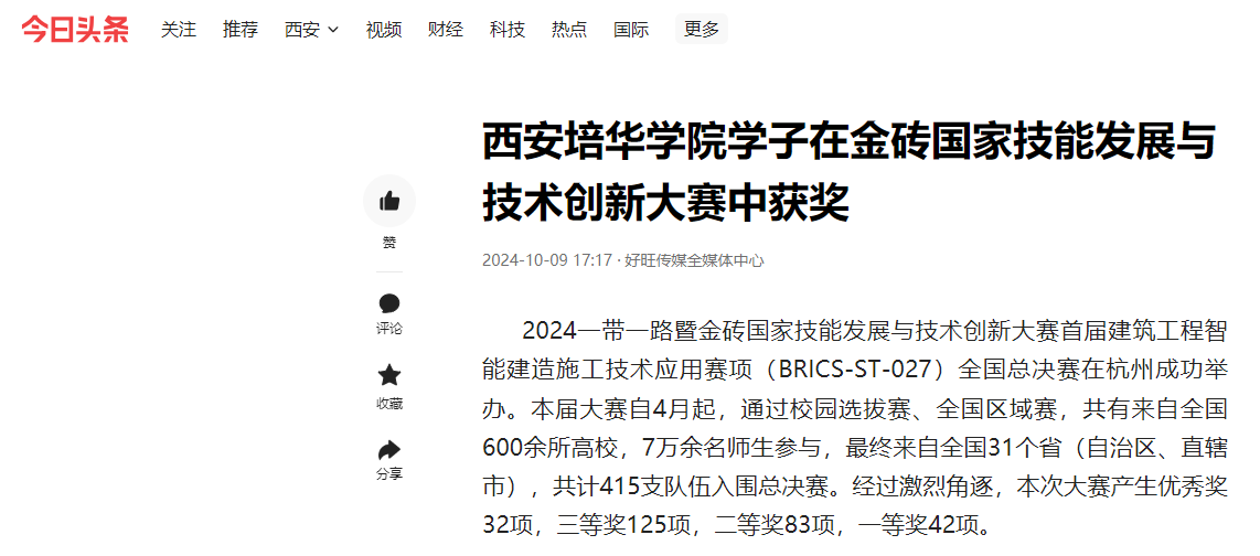 2024一带一路暨金砖国家技能发展与技术创新大赛首届建筑工程智能建造施工技术应用赛项(BRICS-ST-027)全国总决赛在杭州成功举办。本届大赛自4月起,通过校园选拔赛、全国区域赛,共有来自全国600余所高校,7万余名师生参与,最终来自全国31个省(自治区、直辖市),共计415支队伍入围总决赛。经过激烈角逐,本次大赛产生优秀奖32项,三等奖125项,二等奖83项,一等奖42项。