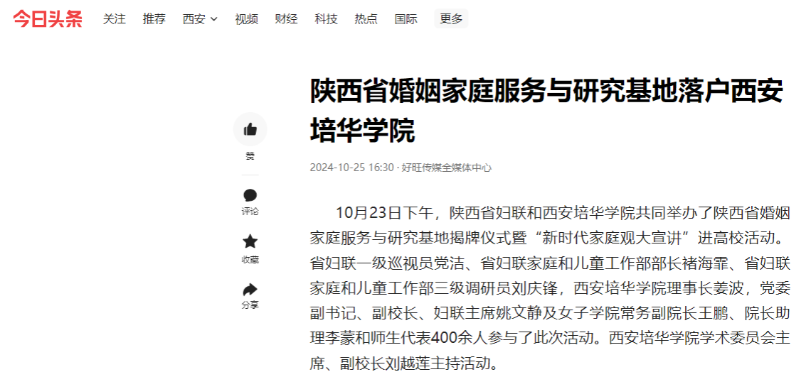 10月23日下午,陕西省妇联和西安培华学院共同举办了陕西省婚姻家庭服务与研究基地揭牌仪式暨“新时代家庭观大宣讲”进高校活动。省妇联一级巡视员党洁、省妇联家庭和儿童工作部部长褚海霏、省妇联家庭和儿童工作部三级调研员刘庆锋,西安培华学院理事长姜波,党委副书记、副校长、妇联主席姚文静及女子学院常务副院长王鹏、院长助理李蒙和师生代表400余人参与了此次活动。西安培华学院学术委员会主席、副校长刘越莲主持活动。