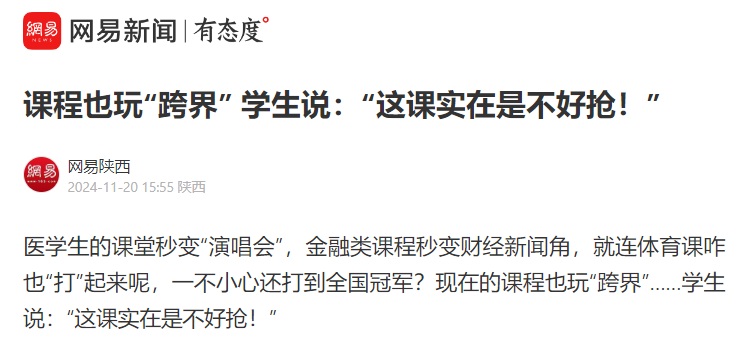 医学生的课堂秒变“演唱会”,金融类课程秒变财经新闻角,就连体育课咋也“打”起来呢,一不小心还打到全国冠军?现在的课程也玩“跨界”……学生说:“这课实在是不好抢!”