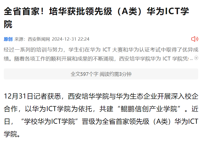 西安培华学院积极对接华为公司,在产业学院建设与应用型人才培养方面迈出了坚实的步伐。2024年初,西安培华学院华为ICT学院,与华为技术有限公司、深圳市讯方技术股份有限公司携手,共同探索产业学院发展的新思路、新方向。以培养高素质技术人才为目标,将产业需求与教学实践紧密结合,力求打造一个集教学、实践、创新、就业于一体的综合性育人平台。为提升学生的专业技能与实践能力,西安培华学院以华为ICT大赛为重要抓手,积极组织各类活动,让学生们在理论与实践的结合中不断提升能力。