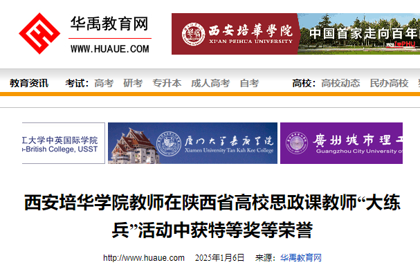1月4日,陕西省教育厅发布了2024年度陕西省高校思政课教师“大练兵”省级现场展示获奖名单。西安培华学院马克思主义学院教师霍艾湘荣获特等奖,毕静烨子荣获一等奖,景安娜荣获二等奖,这一成绩标志着学校在省级“大练兵”展示活动中取得了新突破。