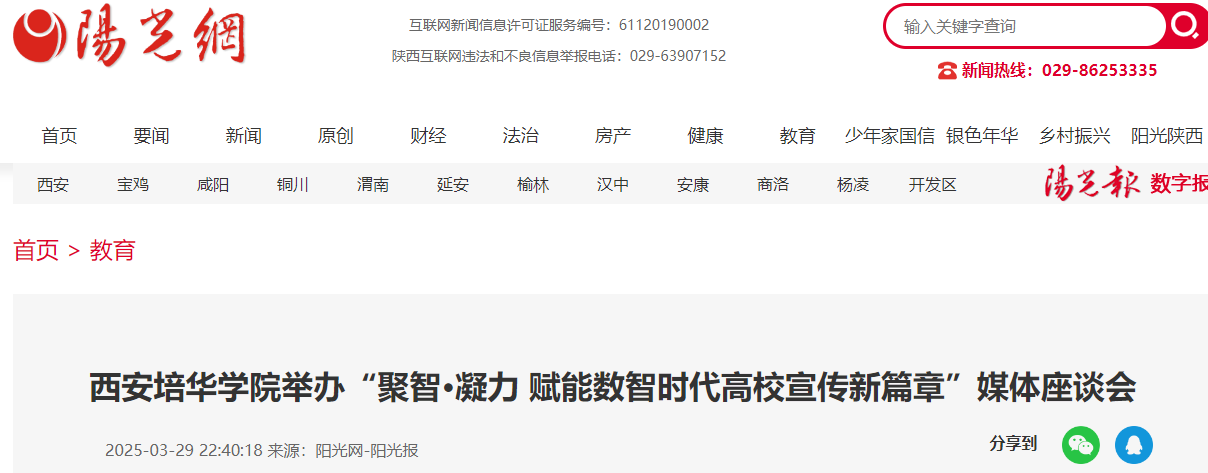 阳光讯(记者 刘杰)3月27日,西安培华学院举办“聚智•凝力 赋能数智时代高校宣传新篇章”媒体座谈会。邀请人民日报、光明日报、中国日报、人民网、陕西日报、陕西电视台等40余家中省媒体对话业务部门,旨在探索媒体融合、产教融合发展的新路径,为陕西民办高等教育高质量发展注入强劲动力,共同书写教育强国的新篇章。学校理事长姜波到会并致辞。党委副书记、副校长姚文静主持座谈会。