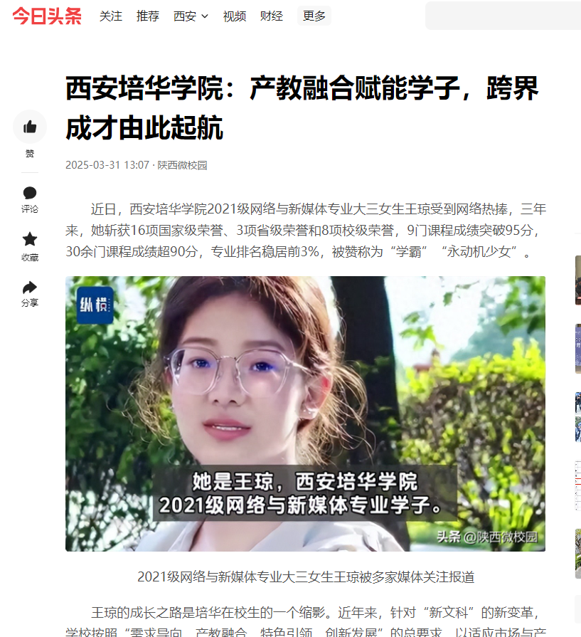 西安培华学院2021级网络与新媒体专业大三女生王琼被多家媒体关注报道