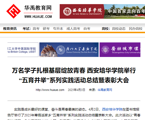 展望未来,西安培华学院将持续深化“实践育人共同体”建设,把社会发展需求转化为人才培养课题,让青年学子在乡村振兴、科技创新、文化传承的一线淬炼中,实现知识体系的立体建构与精神品格的迭代升级。当每个培华青年都将个人理想融入时代经纬,用脚步丈量祖国大地,用奋斗擦亮青春底色,一所现代大学的使命担当,终将汇聚成推动社会进步的磅礴力量。