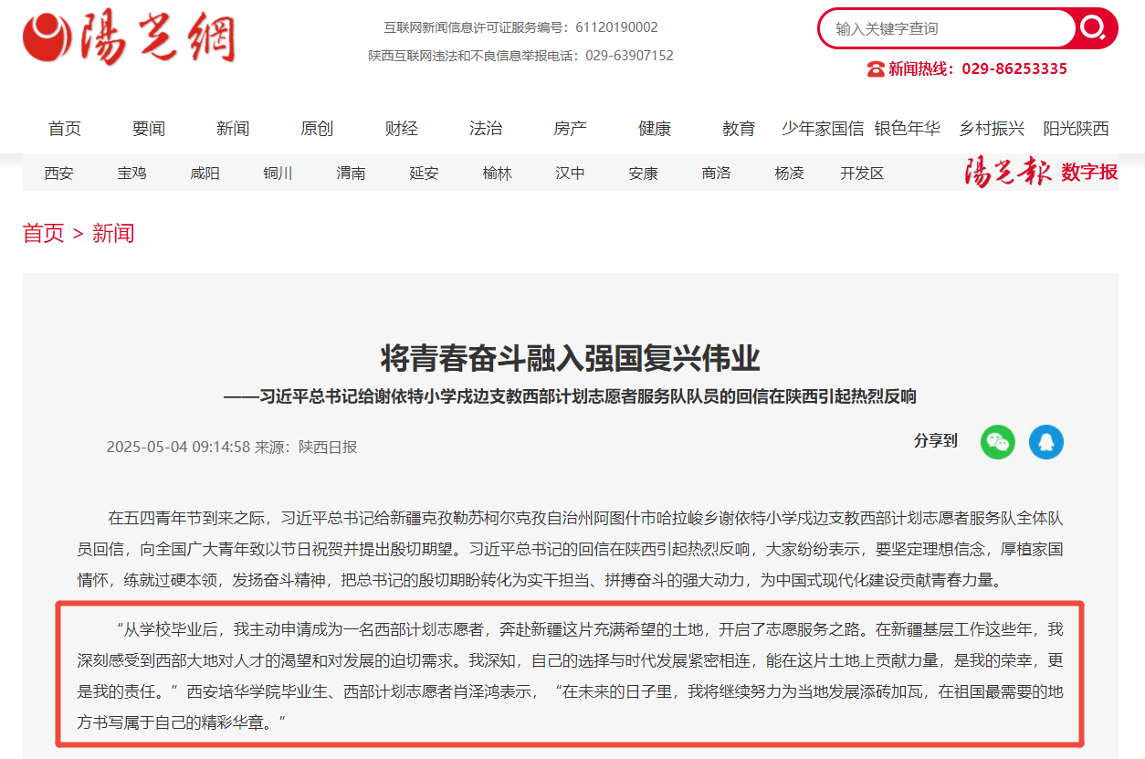 在五四青年节到来之际,习近平总书记给新疆克孜勒苏柯尔克孜自治州阿图什市哈拉峻乡谢依特小学戍边支教西部计划志愿者服务队全体队员回信,向全国广大青年致以节日祝贺并提出殷切期望。习近平总书记的回信在陕西引起热烈反响,大家纷纷表示,要坚定理想信念,厚植家国情怀,练就过硬本领,发扬奋斗精神,把总书记的殷切期盼转化为实干担当、拼搏奋斗的强大动力,为中国式现代化建设贡献青春力量。