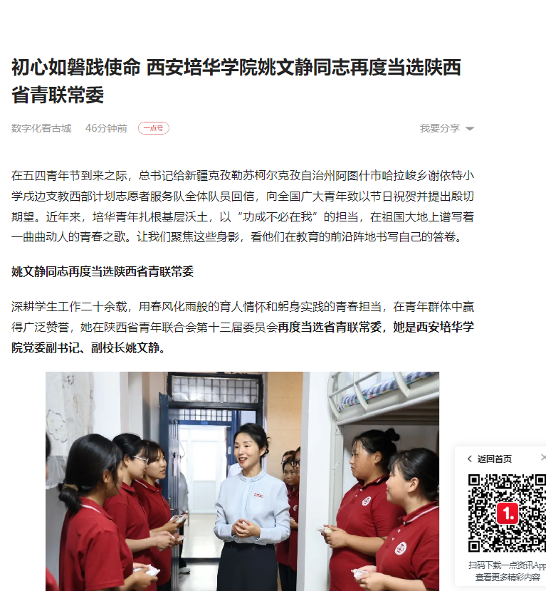 深耕学生工作二十余载,用春风化雨般的育人情怀和躬身实践的青春担当,在青年群体中赢得广泛赞誉,她在陕西省青年联合会第十三届委员会再度当选省青联常委,她是西安培华学院党委副书记、副校长姚文静。