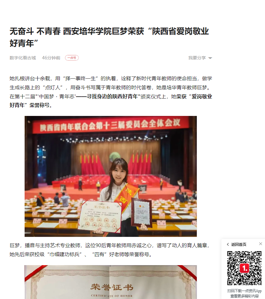 她扎根讲台十余载,用“择一事终一生”的执着,诠释了新时代青年教师的使命担当,做学生成长路上的“点灯人”,用奋斗书写属于青年教师的时代答卷,她是培华青年教师巨梦。在第十二届"'中国梦・青年志'——寻找身边的陕西好青年"颁奖仪式上,她荣获“爱岗敬业好青年”荣誉称号。