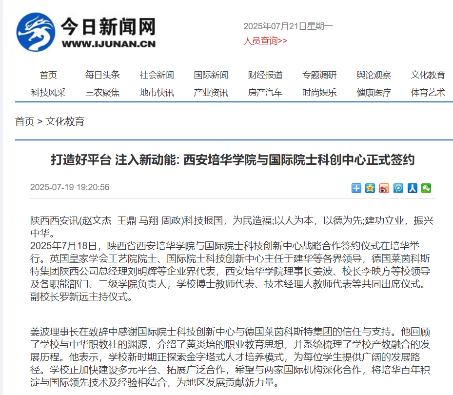 2025年7月18日,陕西省西安培华学院与国际院士科技创新中心战略合作签约仪式在培华举行。英国皇家学会工艺院院士、国际院士科技创新中心主任于建华等各界领导,德国莱茵科斯特集团陕西公司总经理刘明辉等企业界代表,西安培华学院理事长姜波、校长李映方等校领导及各职能部门、二级学院负责人,学校博士教师代表、技术经理人教师代表等共同出席仪式。副校长罗新远主持仪式。