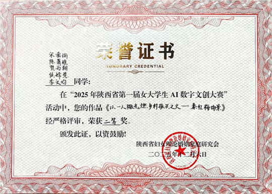 近日,2025年陕西省第一届女大学生AI数字文创大赛结果揭晓。本次比赛面向陕西省各高校在校女大学生及研究生,旨在激发女性学子在人工智能与数字文化领域的创新潜能。由西安培华学院陈欢、陈倩两位老师指导,陈萧雅、侯嫦慧、李文均、贺雨翔、宋秉儒五位同学共同创作的作品《以一人微光燃乡村振兴之火——秦红梅场景》在激烈角逐中脱颖而出,荣获大赛二等奖。