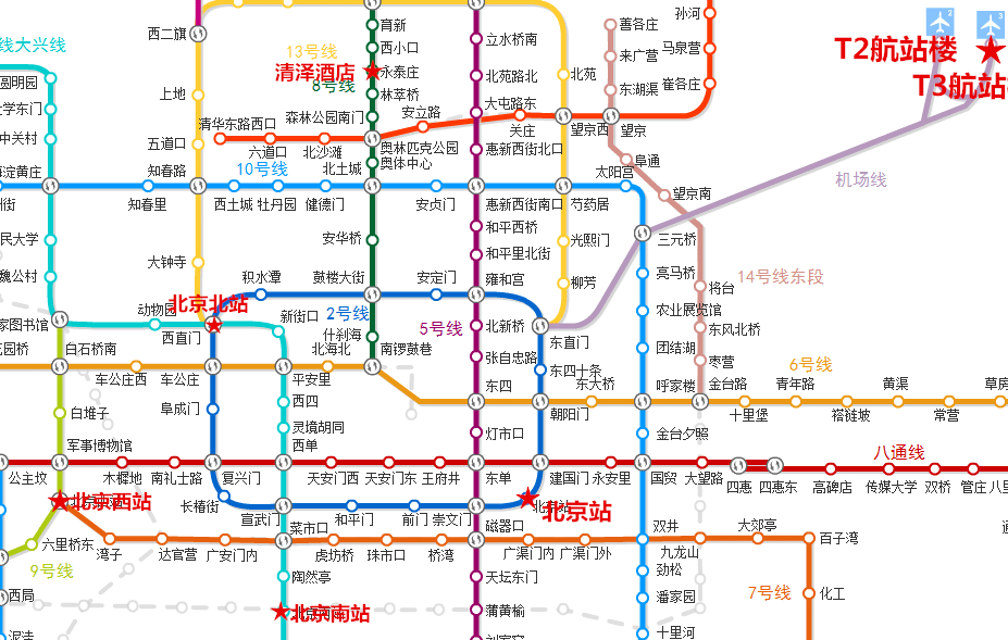 北京各火车站及机场至清泽酒店地铁换乘图