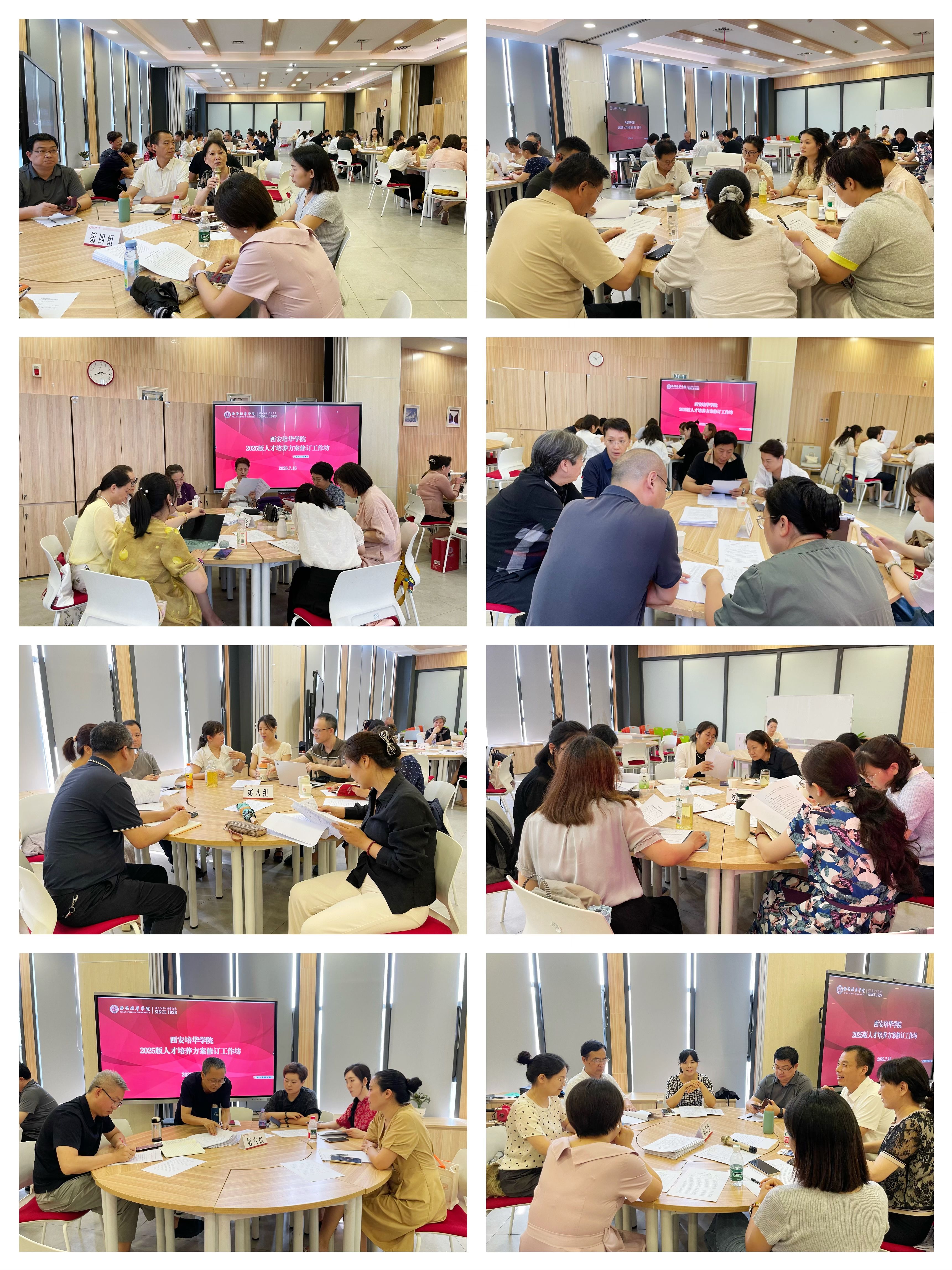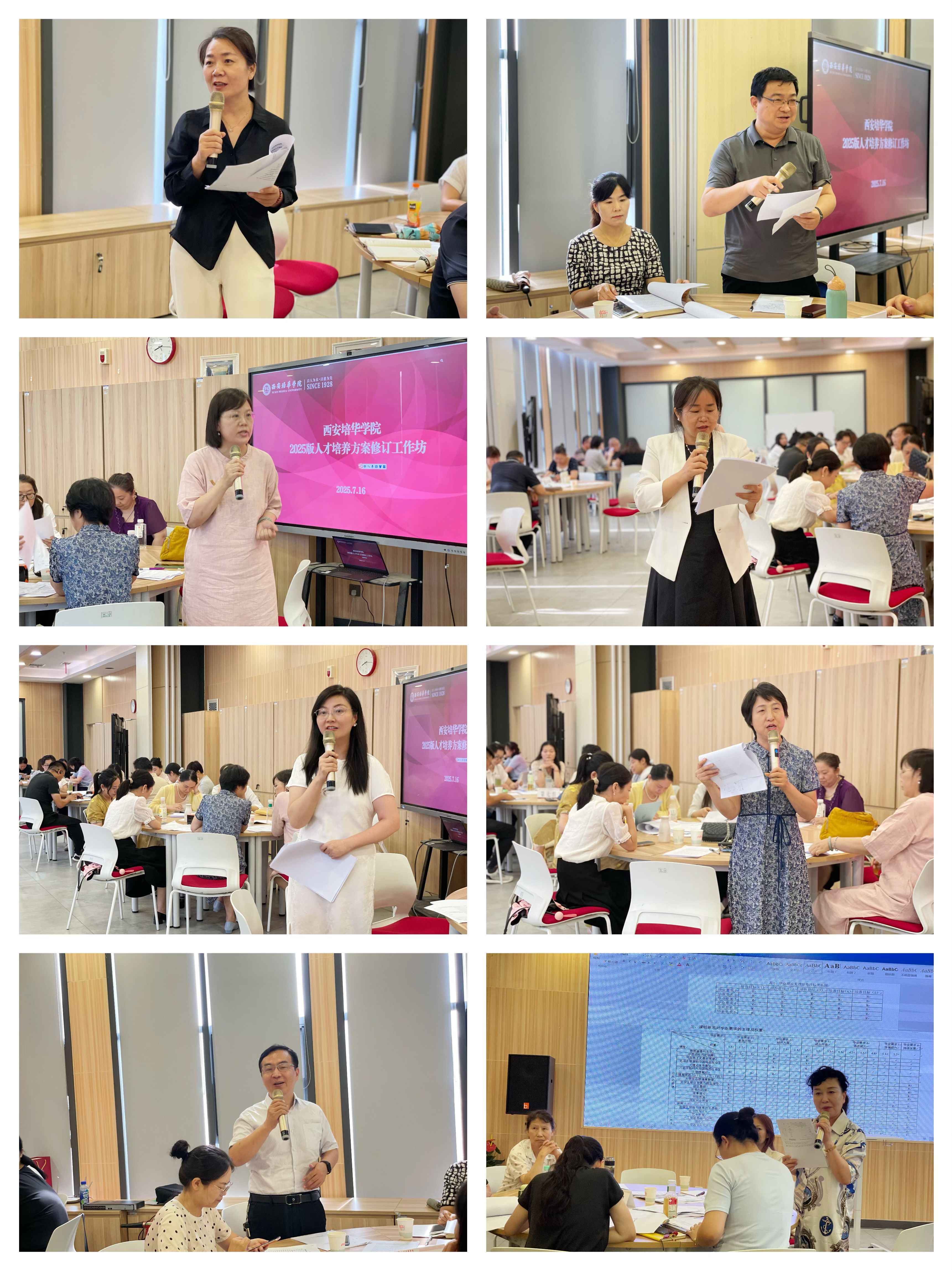 各二级学院依次汇报了2025版本科专业人才培养方案的调整内容,重点包括专业特色定位、课程体系优化、AI技术融入、实践教学优化、个性化与国际化培养等方面,并分享了调整过程中遇到的问题及解决方案。