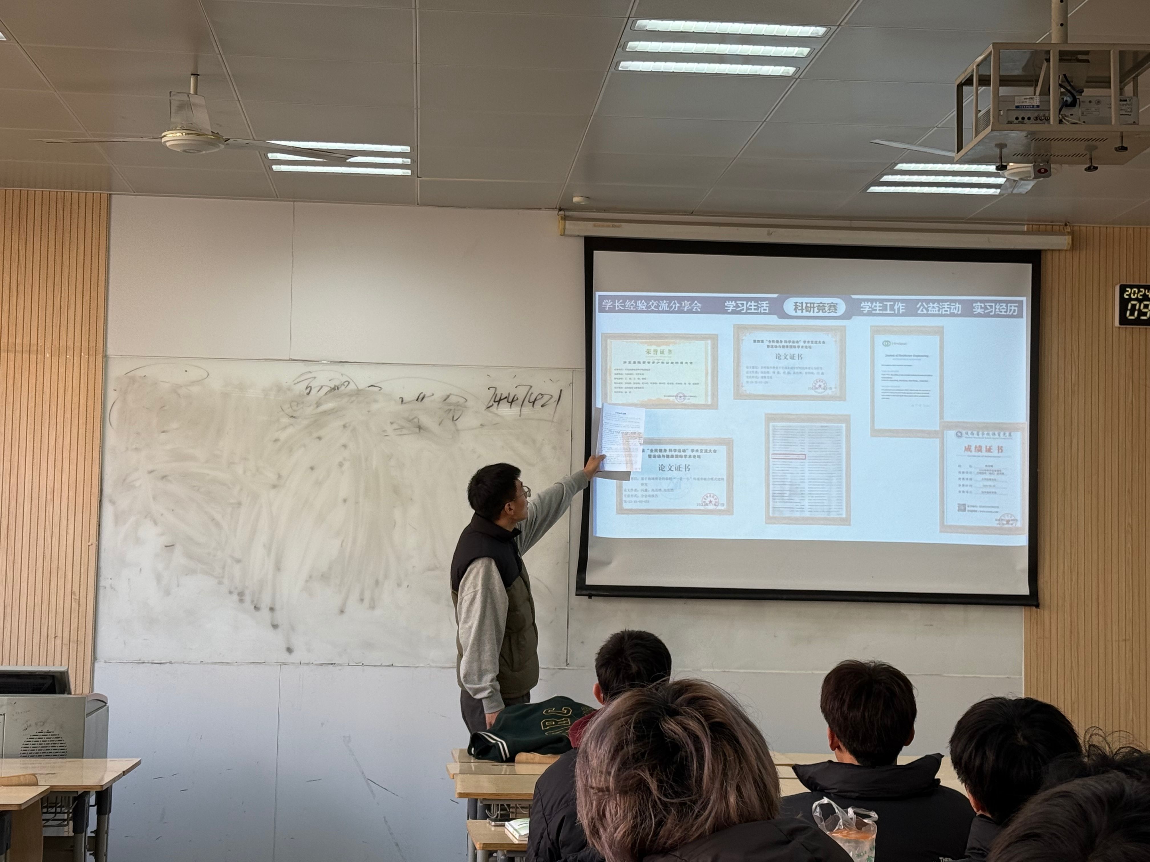 为落实立德树人根本任务,进一步加强学风建设,切实引导广大学生树立正确的成才观,充分发挥榜样的力量,11月21日,我校教务管理中心英才办联合马克思主义学院举办优秀学子进课堂活动,邀请体育学院2021级学生高浩博、传媒与设计学院2022级学生陈静怡、医学院2021级学生李泽城三名国家奖学金候选人分别进入其所在学院2024级英才班学子们分享自己的学习、学科竞赛、科研、实践等经历经验。