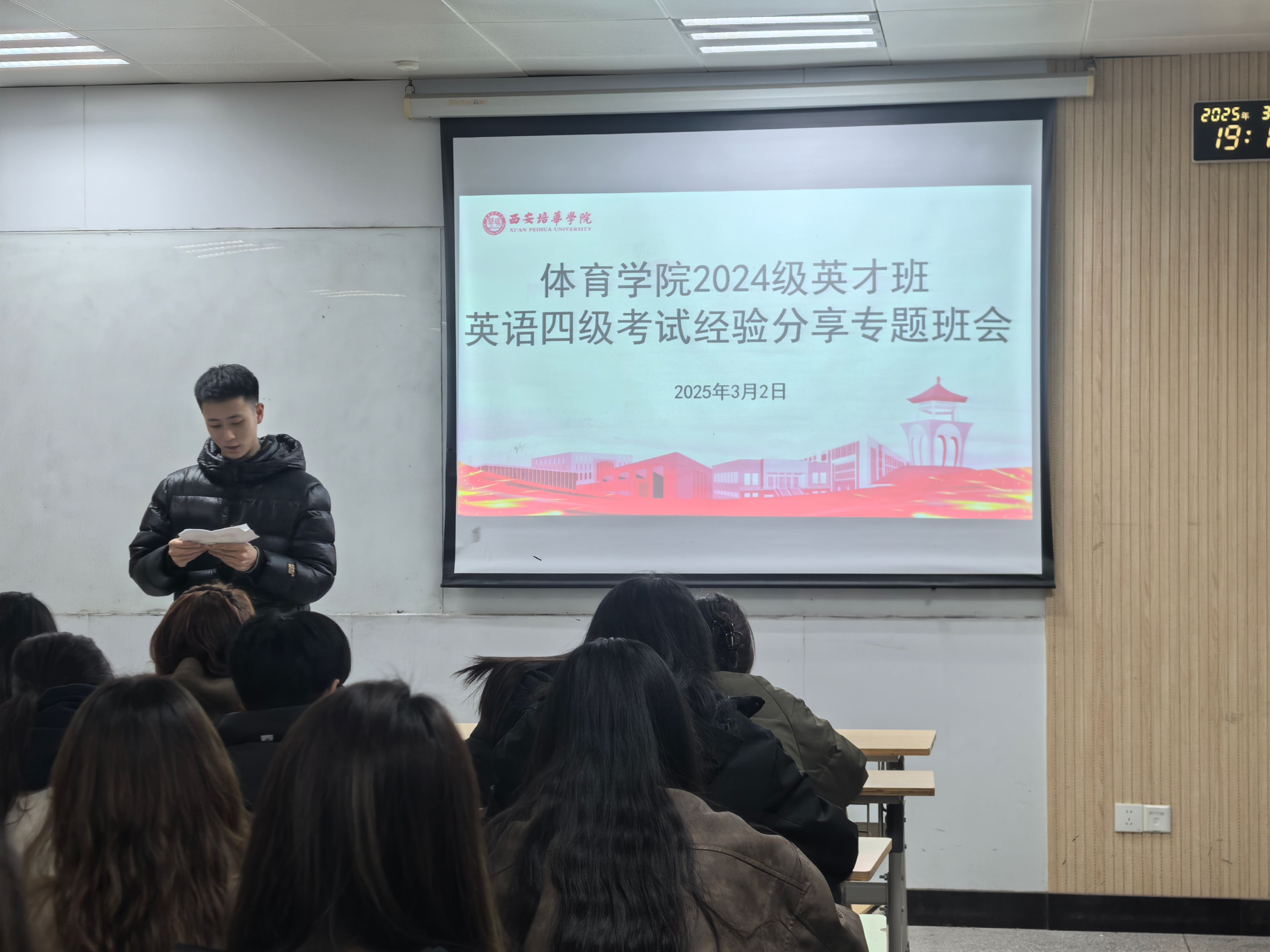 体育学院2024级英才班于3月2日晚在育英楼3320教室召开了四级考试经验分享会。辅导员雍笑笑老师主持了会议,并邀请了英语六级通过者霍逸凡老师和刚通过四级考试的大二学生徐晨学长作为主讲嘉宾。徐晨学长从词汇积累、听力训练到阅读和写作技巧,详细分享了自己的备考心得。