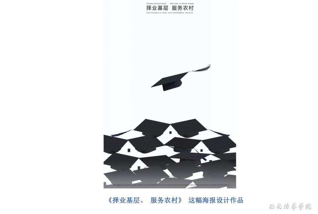 《择业基层、服务农村》这幅海报设计作品上方飘落的学士帽代表大学生走向基层就业,下方越聚越多的学士帽“搭建”起农村的房屋造型,表示大学生为新农村建设贡献自己的力量,该作品反映了社会的大学生就业焦点问题。形象鲜明,针对性强,用色单纯,简洁的黑白对比清新、醒目。