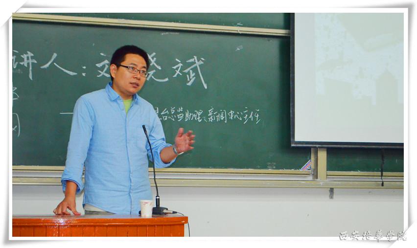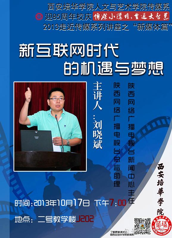 为喜迎我校建校85周年,活跃校园学术氛围。10月17日晚7点,人文与艺术学院传媒系“传媒小讲坛,贯通大智慧——2013走进传媒”系列讲座在J202教室继续开讲。陕西网络广播电视台总监助理、陕西网络广播电视台新闻中心主任刘晓斌老师为传媒类专业学生带来一场《新互联网时代的梦想与挑战》的专题讲座。