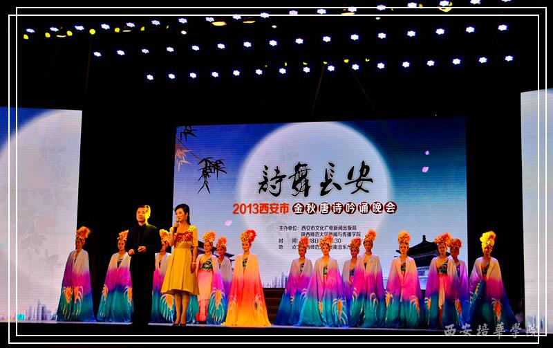 9月18日,西安市文化广电新闻出版局和陕西师范大学新闻与传播学院联合主办的“诗舞长安”金秋唐诗吟诵晚会在陕西师范大学长安校区终南音乐厅举行。应陕西师范大学新闻与传播学院副教授朱晓彧老师的邀请,我院传媒系王增智、余文、王媛老师和50余名播音主持专业学生一同观看了精彩的演出。著名艺术家海茵、董少敏、王英、蒋瑞征、凌江(西安培华学院人文与艺术学院播音与主持专业专任副教授)、晓河、严一宁等,和著名主持人孙维、朱咏东在晚会上同台献艺,倾情朗诵。西安市文广局局长严彬、陕西师范大学校长助理党怀兴等领导也观看了演出。