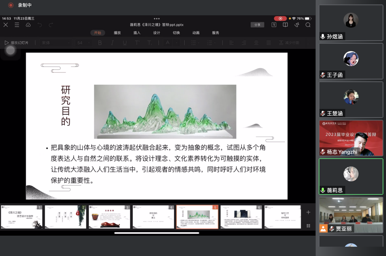 答辩开始,工艺美术专业带头人杨志副教授就此次答辩流程作了简要说明,提醒学生在答辩过程中注意语言表述,认真记录,以便进一步完善开题报告。开题答辩分为学生陈述、老师点评与提问、学生回答问题等环节。学生依次对设计的选题背景、研究目的和意义、研究内容、预期成果和创新点进行阐述汇报,答辩陈述结束后,老师就目前开题情况作出点评提问,指出学生需改进的内容以及下一步计划。同学认真记录各位老师意见,继续优化作品方案,跟进论文框架。