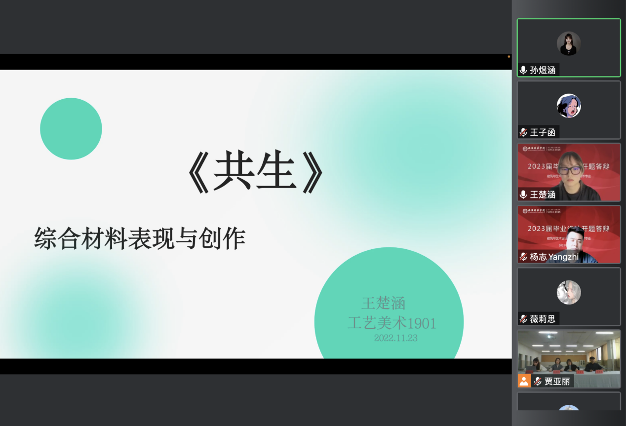 2022年11月23日,建筑与艺术设计学院工艺美术专业组织开展2023届毕业设计开题答辩工作。工艺美术专业带头人杨志副教授担任答辩组组长、专业负责人贾亚丽老师、专业教师原雪娜老师、张钦老师担任答辩评委,孙煜涵老师任答辩秘书。此次答辩本专业针对不能返校的毕业生以线上方式进行,其他学生以审阅开题报告的形式进行开题。