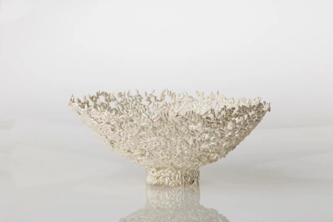 南京艺术学院金属工艺专业师生用作品去表达他们对这个世界的认知以及背后的思考。这也是南艺金工在教学和实践中一直秉承的精神内核。技艺得益于实践,创新得力于质疑;技艺得益于传递,创新得力于交流;技艺得益于学习,创新得力于发现;白银,这种泛着冷光的坚硬金属在同学们双手捶打、扭转、切割、焊接、打磨和抛光之下,变换为各种形式的器皿和雕塑。作者用刻苦专注的创作向观众展现了金属多种工艺的可能性,从而完成自我学习中走进与走出的一次蜕变。