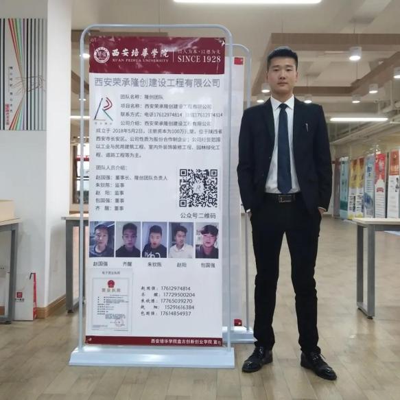 赵国强,男,1998年生,西安培华学院建筑与艺术设计学院建设工程管理20届毕业生。在校期间,该生于2018年5月创办了西安荣承隆创建设工程有限公司,公司主要经营房屋建筑工程和桥梁建筑工程,曾参加陕南移民建筑项目,共计1300平米,道路工程6公里等。2019年9月,该生在百度创业中心创办了自己的第二家公司,主营短视频行业。