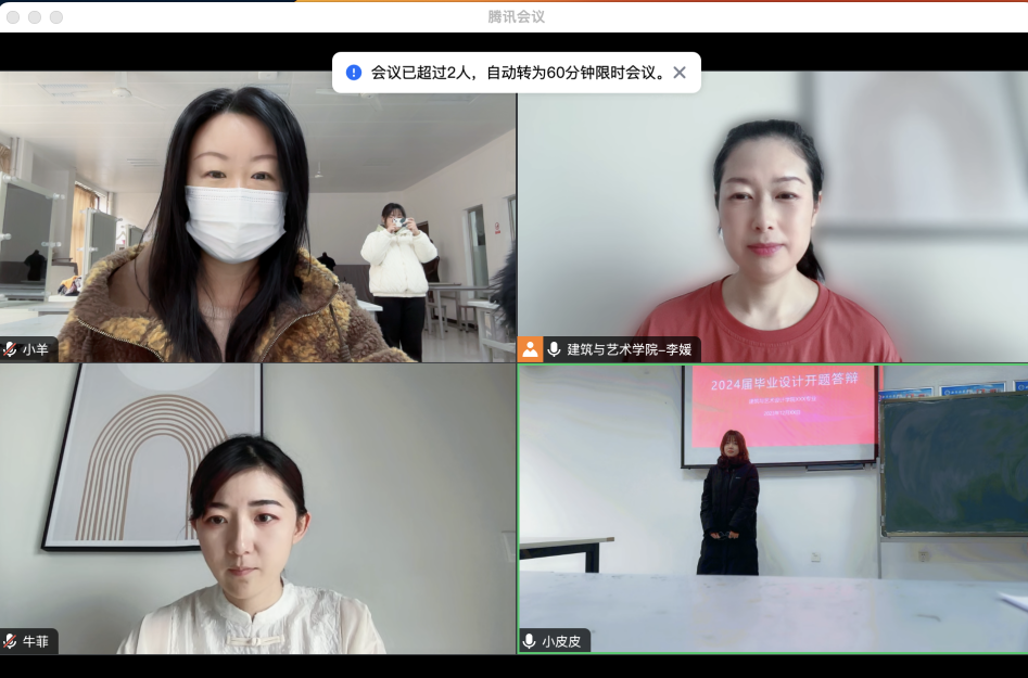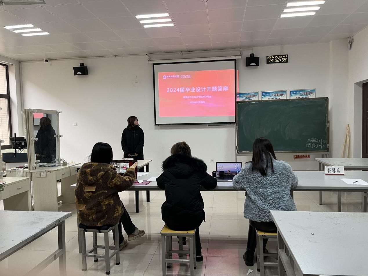 2023年12月15日下午,建筑与艺术设计学院服装与服饰设计专业开展了2024届毕业设计开题答辩工作,答辩过程采用线上线下结合的方式进行。服装与服饰设计专业带头人李媛老师担任答辩组组长,杨周敏老师、牛菲老师和张羽晗老师担任答辩评委,马苑老师担任答辩秘书。