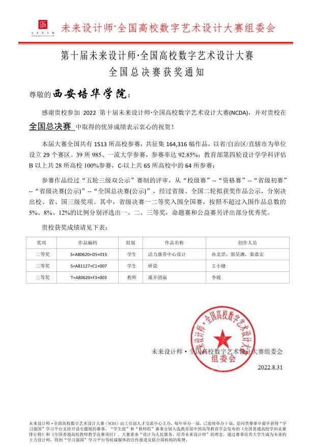本届大赛共有1513所高校参赛,其中包括39所“985”高校,赛事以省/自治区/直辖市为单位设立29个赛区,共征集164316幅作品。服装与服饰设计、环境设计与建筑学专业师生在竞争如此激烈的情况下斩获国家级二等奖一项、三等奖两项;省级一等奖一项、二等奖六项、三等奖六项;西安培学院荣获省级优秀组织单位。