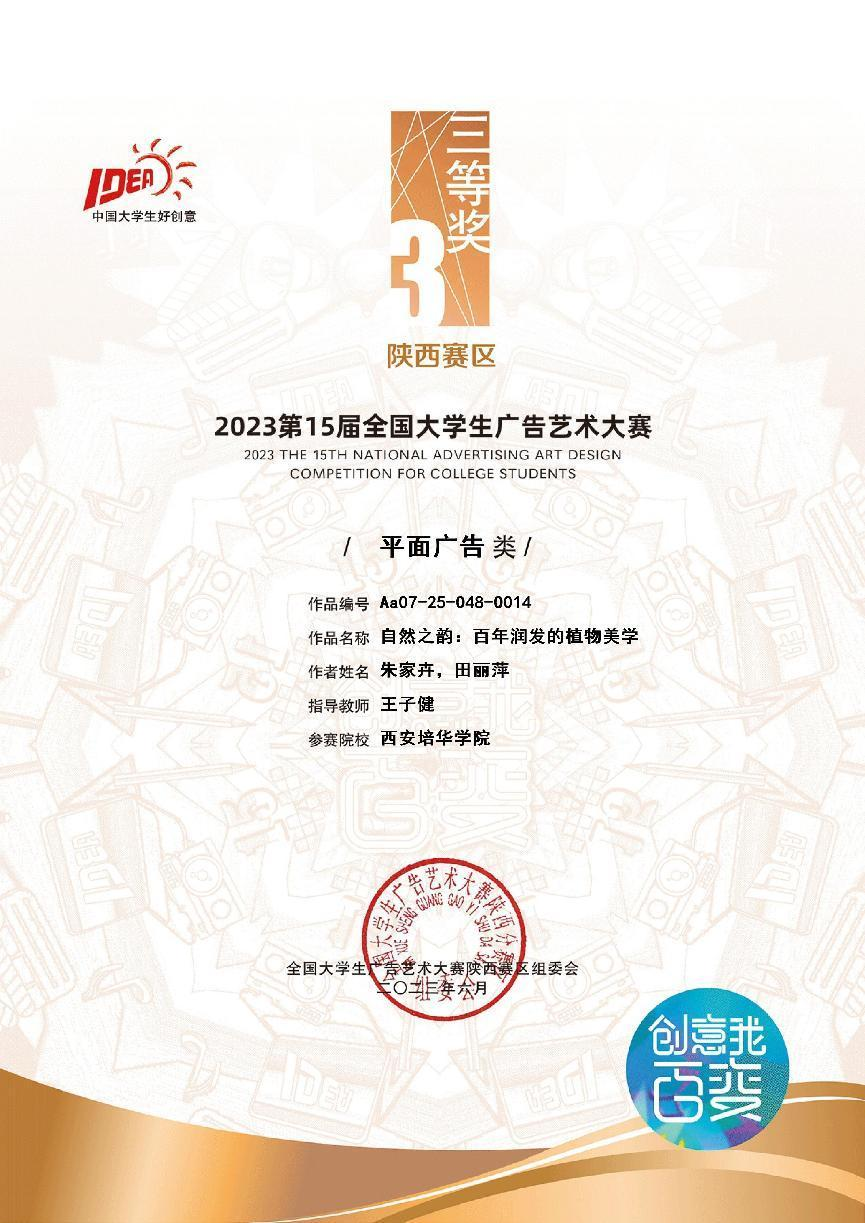近日,第 15 届全国大学生广告艺术大赛落下帷幕,培华学子在全国大学生广告艺术大赛中荣获陕西省赛区一等奖2项、二等奖4项,三等奖3项,优秀奖1项。